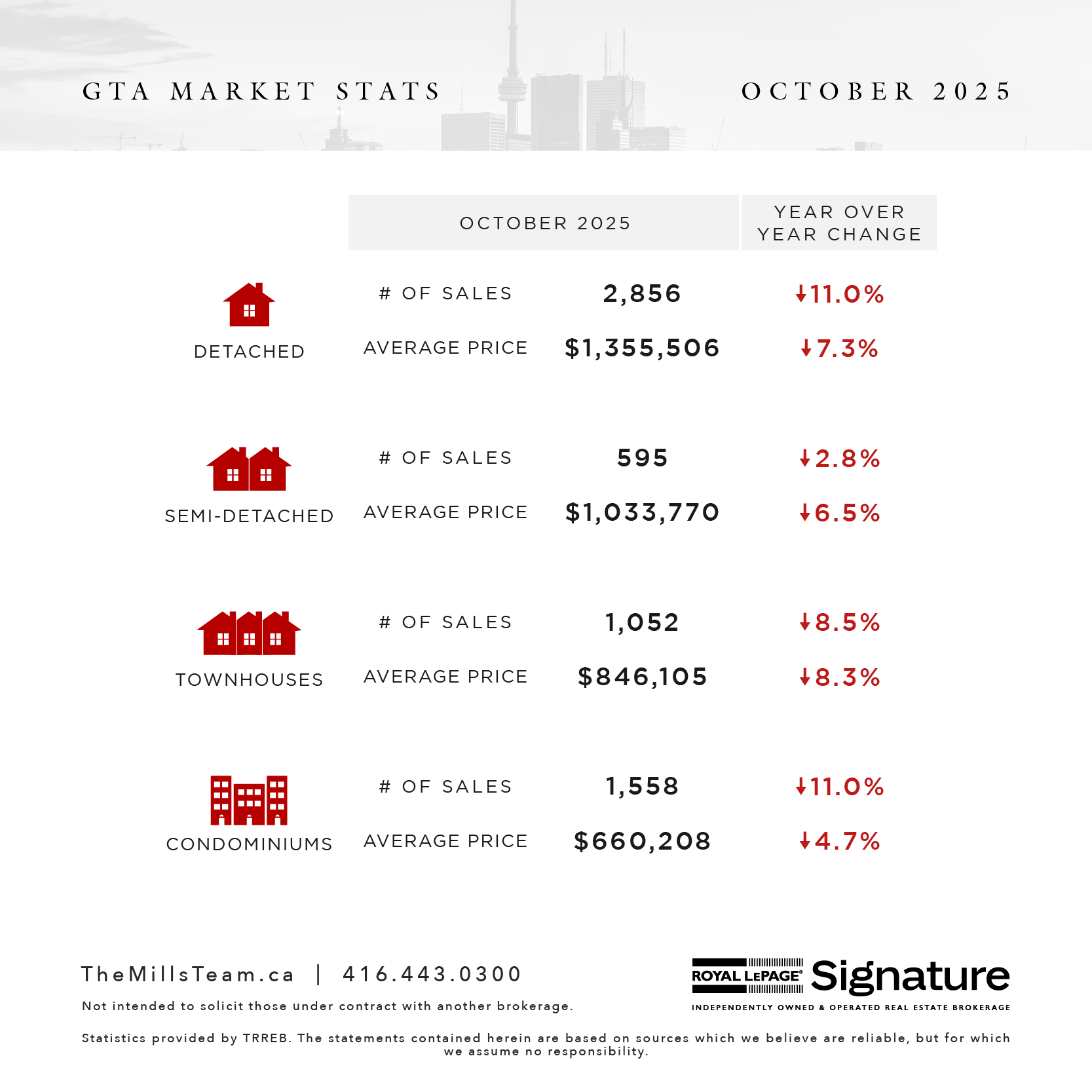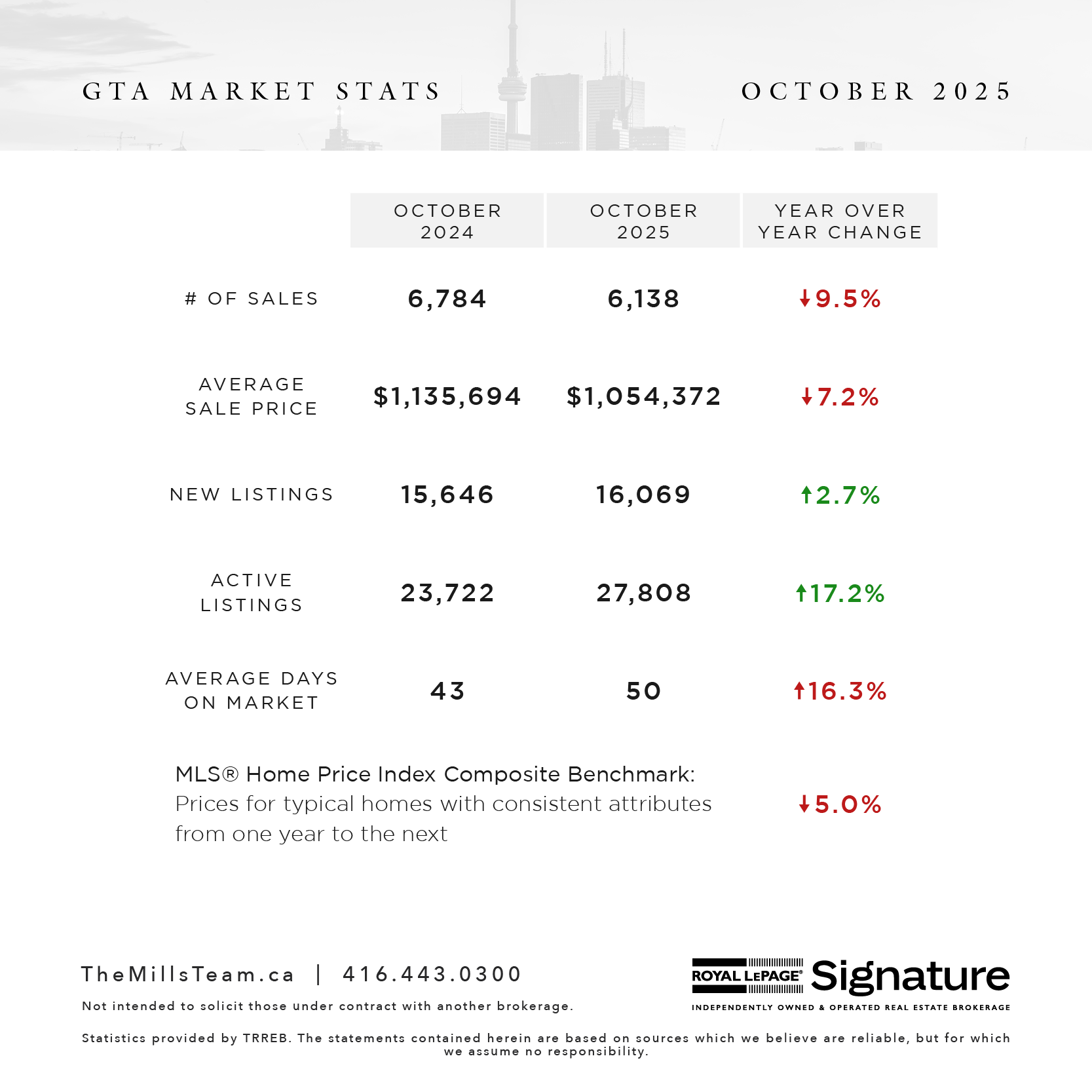 TORONTO, ONTARIO, November 5, 2025 – Home sales in the Greater Toronto Area (GTA) were down year-overyear in October, while new listings were up. Market conditions continued to favour homebuyers, as average selling prices were negotiated down alongside lower mortgage rates. “Buyers who are confident in their employment situation and ability to make their mortgage payments over the long term are benefitting from affordable housing market conditions relative to the past few years. However, many intending homebuyers remain on the sidelines due to uncertainty about their economic future,” said TRREB President Elechia Barry-Sproule. GTA REALTORS® reported 6,138 home sales through TRREB’s MLS® System in October 2025 – down by 9.5 per cent compared to October 2024. New listings entered into the MLS® System amounted to 16,069 – up by 2.7 per cent year-over-year.