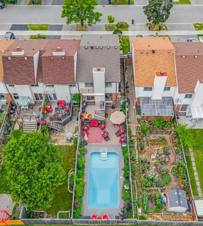 A rare opportunity to own a stunning four-bedroom, three-bathroom end-unit townhome on this highly coveted, family-friendly street—first offering in years! If you love to entertain, this is your dream come true. The sun-drenched, south-facing backyard is an absolute showstopper, featuring a full-sized pool perfect for summer fun, gatherings, and hours of enjoyment with family and friends.