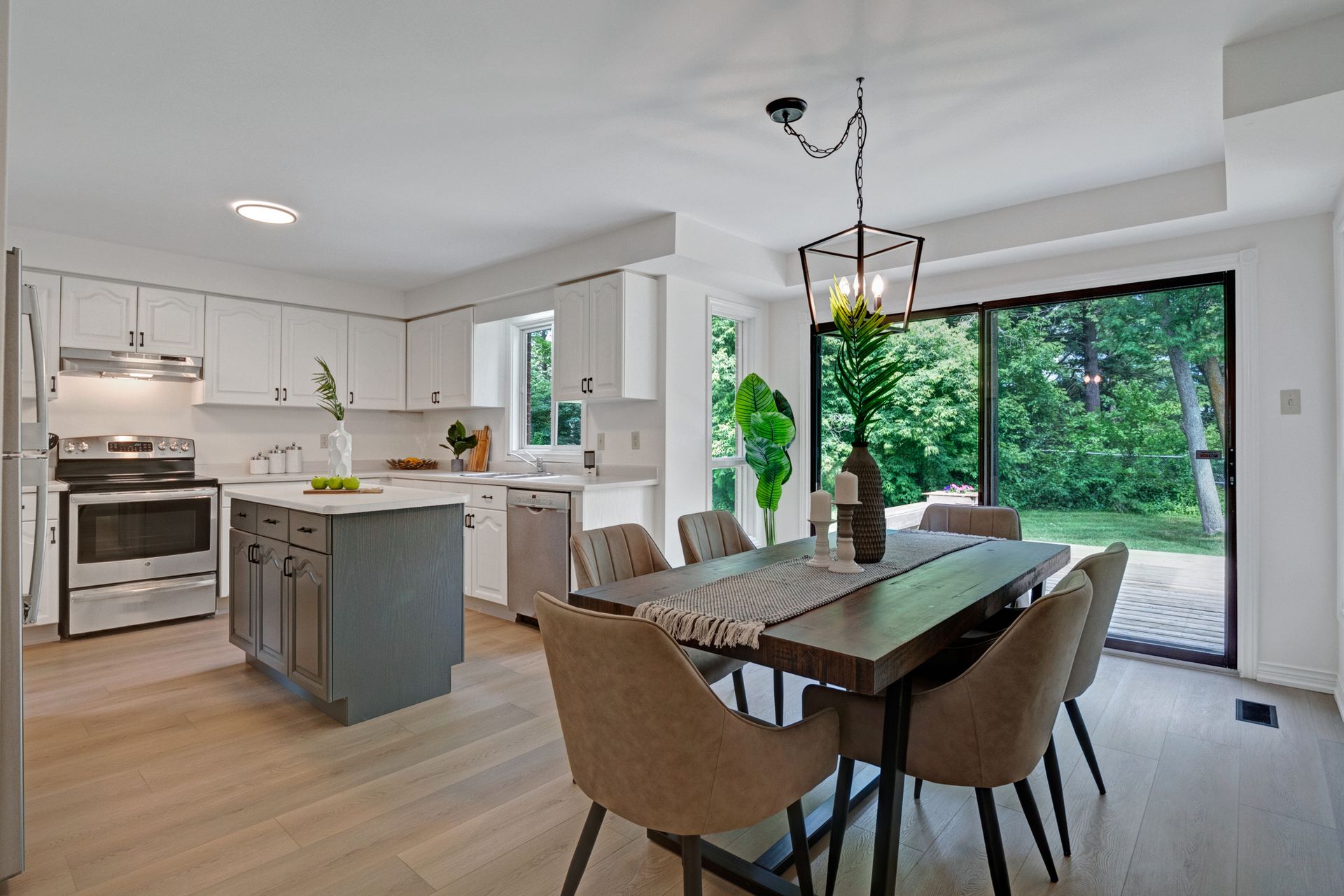 The ideal eat-in kitchen layout features an adjacent family room spanning the back of the house (originally open on builder plan to the family room but enclosed by the owner). Easily reopen to combine the spaces. The center kitchen island, abundant counter space, cabinetry, and roomy eat-in area overlook the gorgeous greenspace. Walk out from both the kitchen and family room to the large deck and flat land - summer never looked so good! Enjoy the separate living and dining rooms, plus a main floor 5th bedroom or home office.