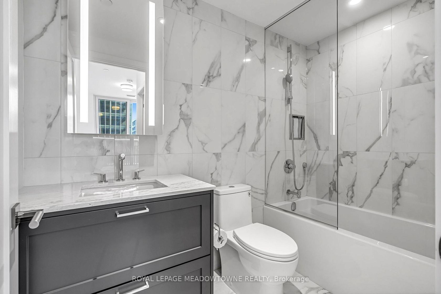 Welcome to Aqualuna, Toronto's iconic waterfront address. This brand new never lived in1bedroom plus den, 2 bath suite offers 809 sq ft of thoughtfully designed living space complemented by two private balconies with stunning city and lake views. Step inside to soaring9ft ceilings and engineered white oak hardwood flooring throughout. The open concept layout is both spacious and practical, blending style with functionality. The designer kitchen features Irpinia cabinetry in a sleek two-tone finish, quartz countertops with a matching backsplash, under-cabinet lighting, a Blanco undermount sink with Hansgrohe faucet, and fully integrated Miele appliances including fridge, cooktop, wall oven, speed oven, dishwasher, and hood fan. A Whirlpool stacked washer and dryer add everyday convenience. The primary bedroom offers its own private balcony, custom closets with organizers, and a spa-inspired ensuite finished with Sivec marble, large-format porcelain tile, and premium Hansgrohe fixtures. A second full bathroom is equally stylish with graphite marble and matte black hex tile, providing comfort for residents and guests alike. Nestled within a 13 acre master planned community, Aqualuna combines striking architecture with a serene lakeside setting. Smart Home Technology via Tridel Connect elevates the living experience, offering modern convenience and peace of mind. This is waterfront luxury at its finest, designed for those who value elegance, comfort, and lifestyle.***THIS IS NOT ANASSIGNMENT SALE***UNIT FULLY CLOSED***Parking Available From Tridel For $85,000. EV Parking Available. For $105,000.