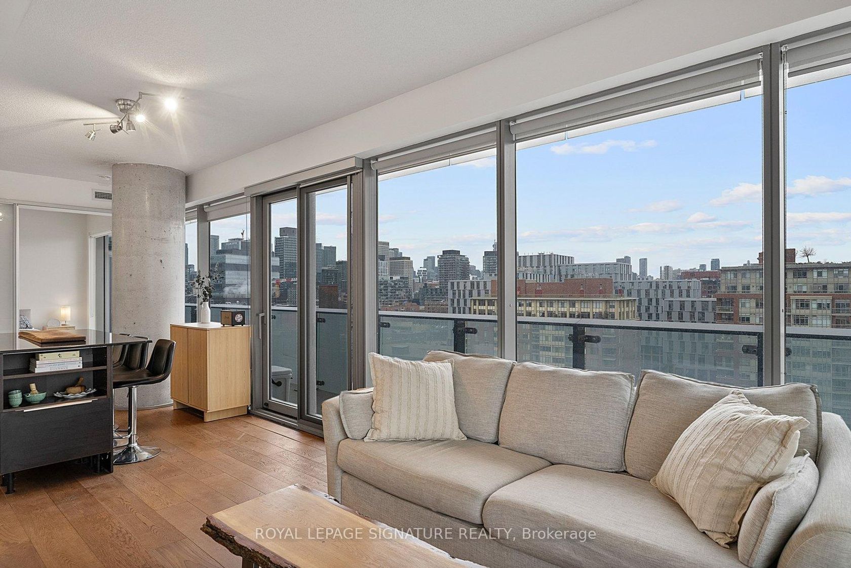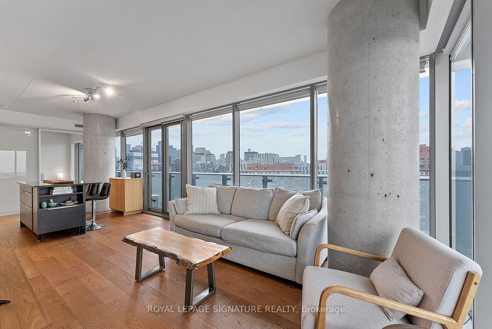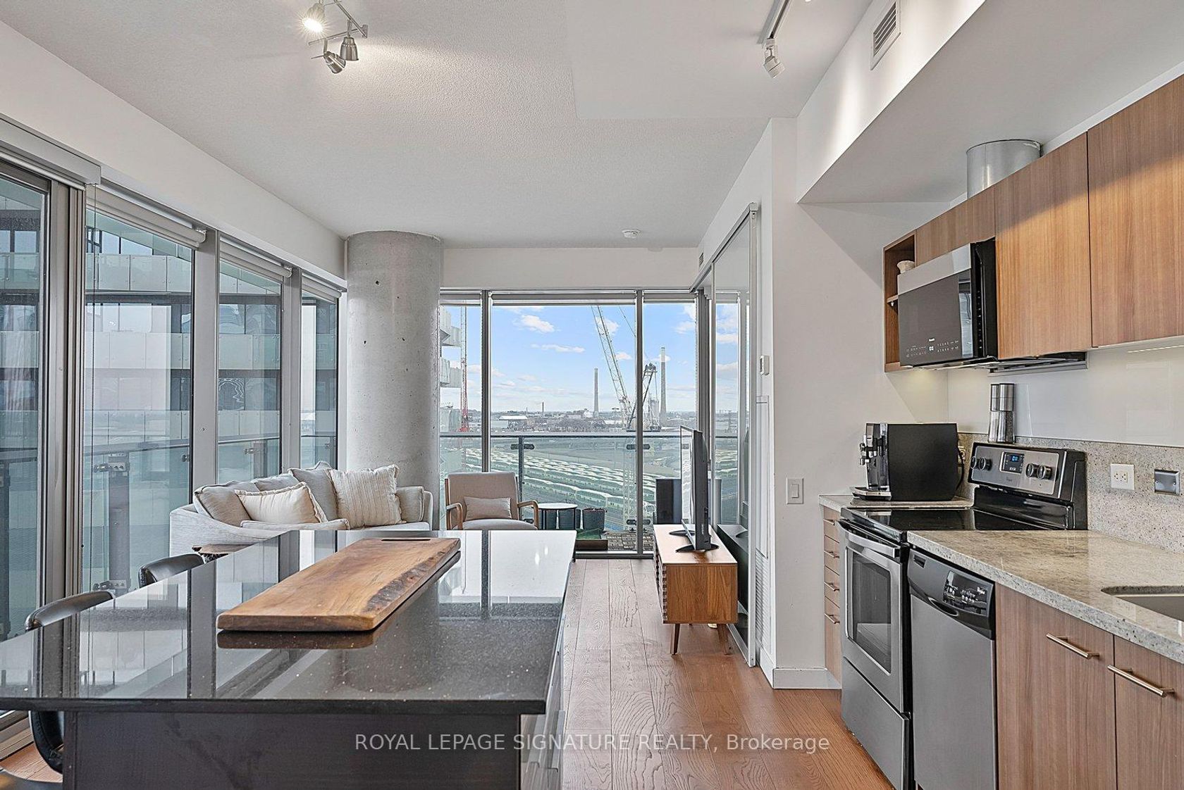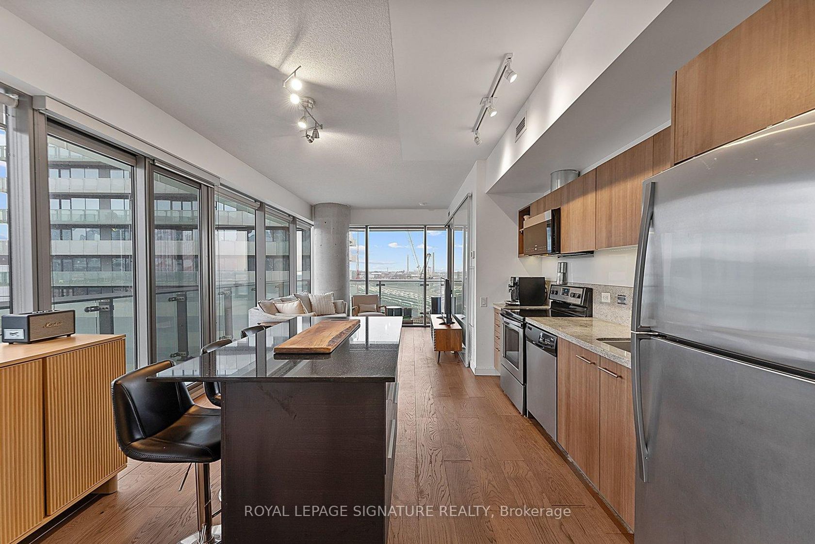 Welcome to suite #1103, a large corner unit in the heart of the Distillery District. The modern kitchen features stainless steel appliances and a breakfast island overlooking the combined living and dining space. Floor-to-ceiling windows featuring custom blinds throughout bring in abundant natural light and open to a wraparound terrace with city views. A split-bedroom layout places the bedrooms on opposite sides of the unit for added privacy. The primary bedroom includes a walk-in closet, blackout blinds, and a 4-piece ensuite. The second bedroom offers a closet and its own 3-piece ensuite. Wonderfully maintained, this suite offers over 800 sq ft of interior living space plus the expansive terrace. Located steps from shops, restaurants, and cafes in the Historical Distillery District, with easy access to public transit and parks. Includes parking and locker.