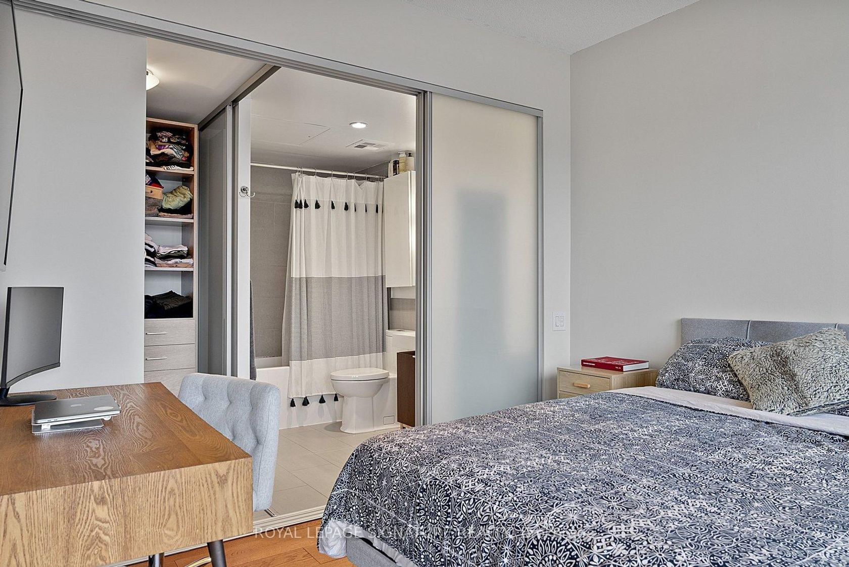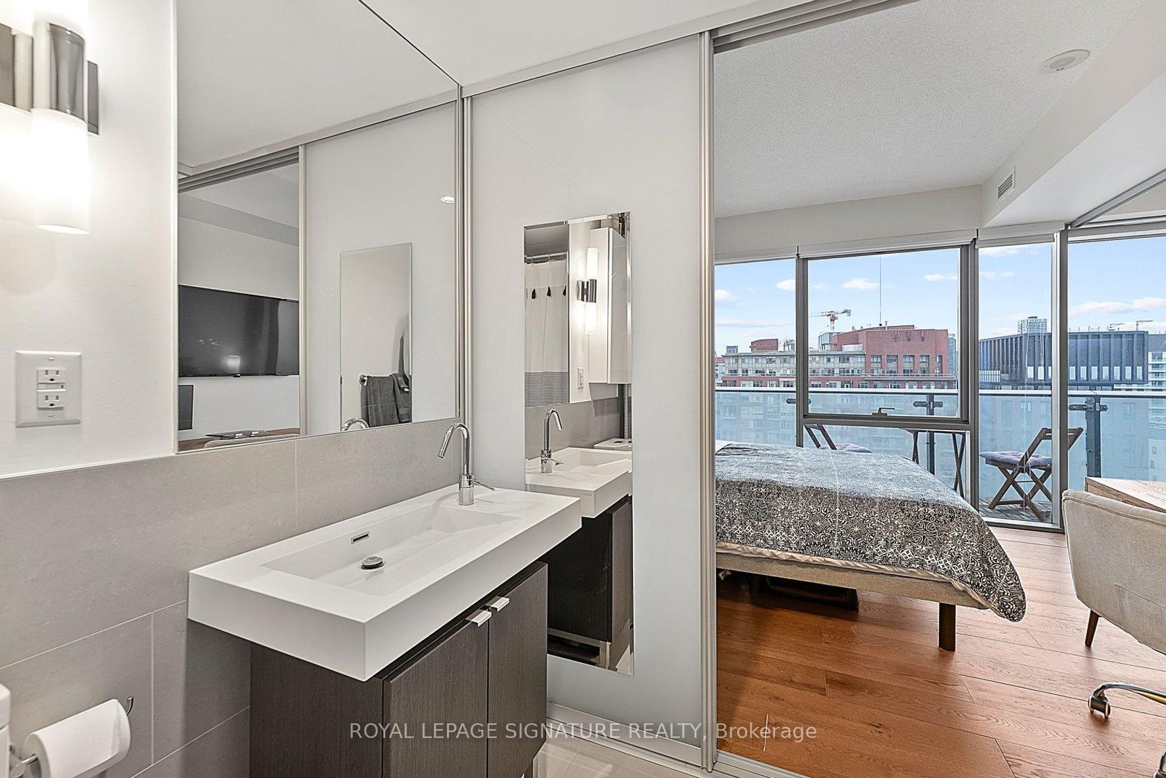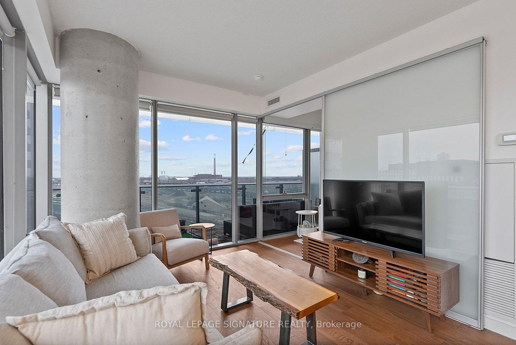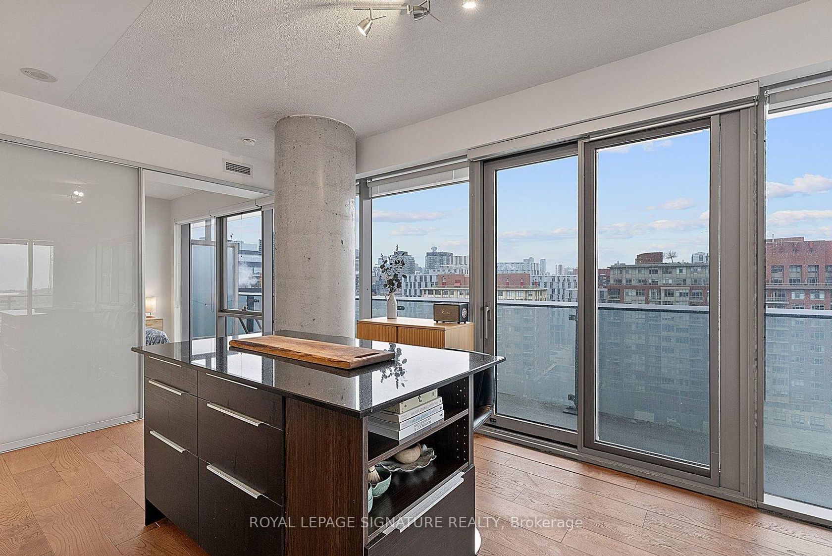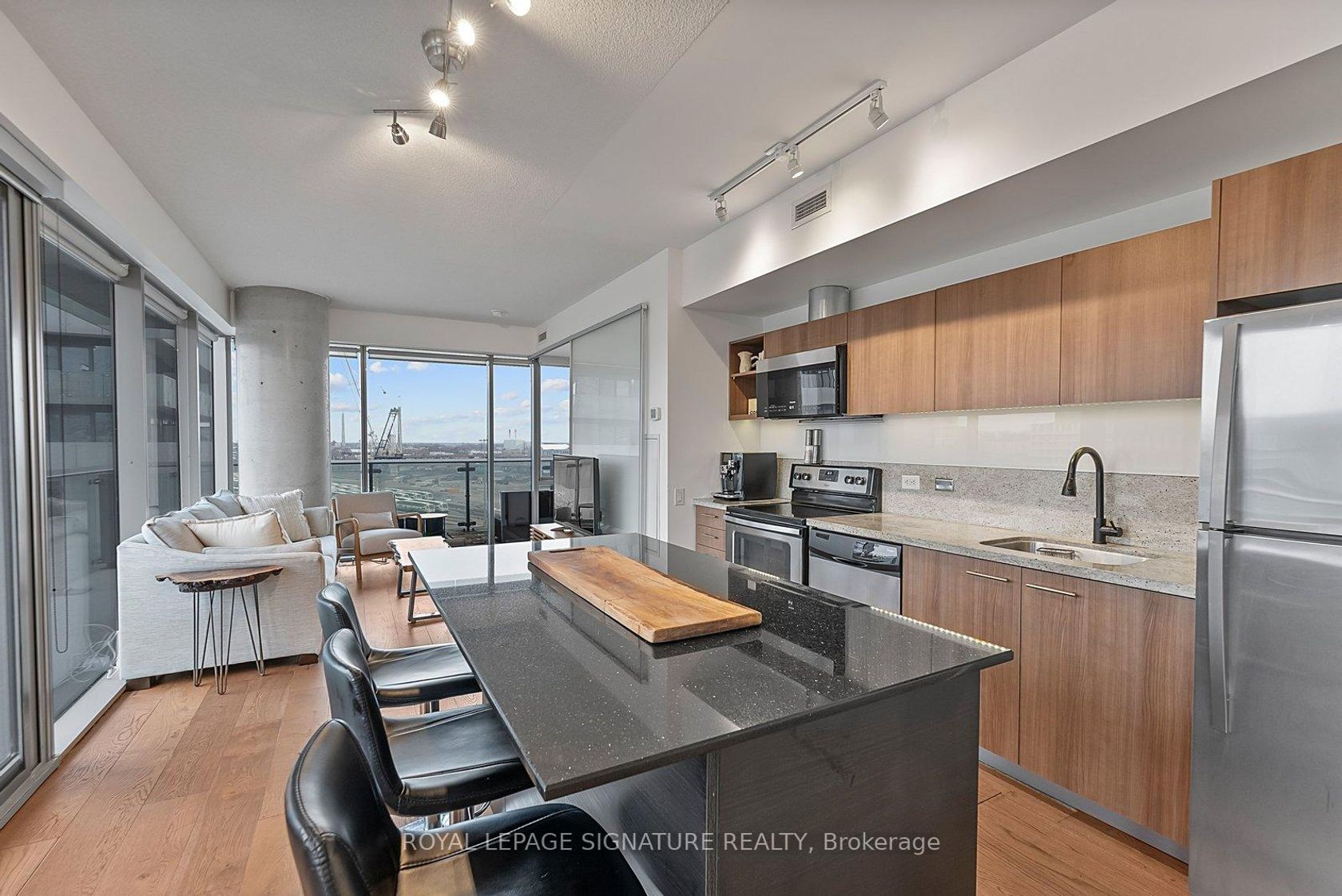 Welcome to suite #1103, a large corner unit in the heart of the Distillery District. The modern kitchen features stainless steel appliances and a breakfast island overlooking the combined living and dining space. Floor-to-ceiling windows featuring custom blinds throughout bring in abundant natural light and open to a wraparound terrace with city views. A split-bedroom layout places the bedrooms on opposite sides of the unit for added privacy. The primary bedroom includes a walk-in closet, blackout blinds, and a 4-piece ensuite. The second bedroom offers a closet and its own 3-piece ensuite. Wonderfully maintained, this suite offers over 800 sq ft of interior living space plus the expansive terrace. Located steps from shops, restaurants, and cafes in the Historical Distillery District, with easy access to public transit and parks. Includes parking and locker.